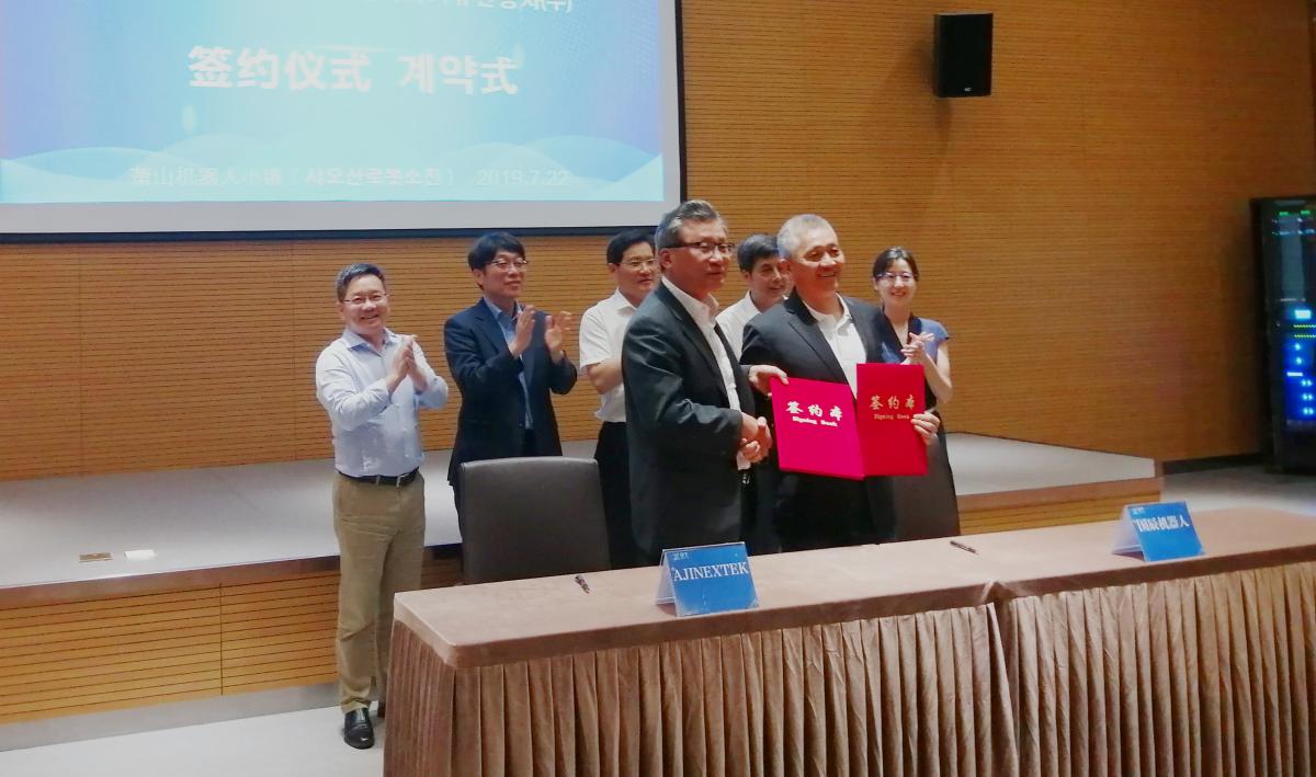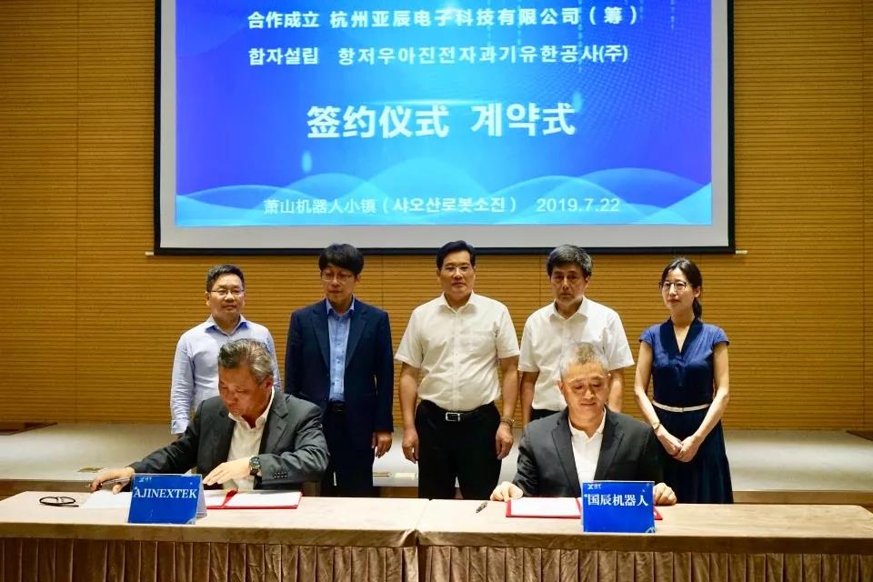 【國辰訊】2019年7月22日,杭州國辰機器人科技有限公司與韓國(株)亞進EXTEK合作成立合資公司簽約儀式在蕭山機器人小鎮(zhèn)隆重舉行。蕭山經(jīng)濟技術開發(fā)區(qū)黨工委委員、管委會副主任徐建中,開發(fā)區(qū)招商局副局長、機器人小鎮(zhèn)工作組負責人陳笑,浙江省機器人產(chǎn)業(yè)發(fā)展協(xié)會秘書長王國耀,韓國大慶機器人振興社會長金昌浩,杭州國辰機器人科技有限公司首席戰(zhàn)略官王國成、韓國(株)亞進EXTEK常務崔成赫等出席簽約儀式。